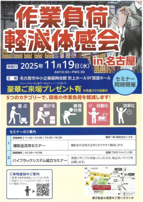 作業負荷軽減体感会 in 名古屋2025年11月19日(水)10:00~17:00名古屋市中小企業振興会館 吹上ホール9F展望ホール名古屋市千種区吹上二丁目6番3号