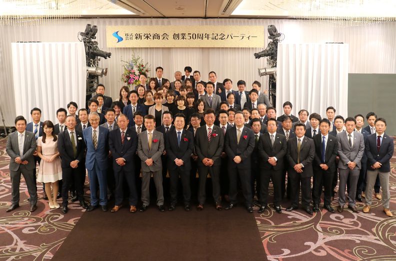 みなさん、こんにちは。社長の時津達也です。9月22日(土)名古屋市内のホテルで「株式会社新栄商会創業50周年記念パーティー」を行いました。日頃大変お世話になっている主力仕入先メーカー様と弊社社員と合わせまして約180名の盛大なパーティーとなりました。スペシャルゲストのステージも大変盛り上がりました。ご出席頂いた皆様、誠にありがとうございました。